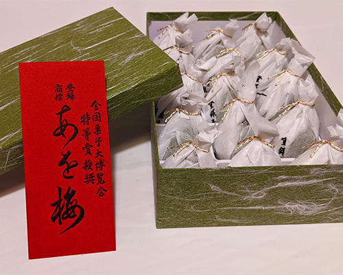 春浅いころに花を咲かせた梅が、初夏ともなれば青い玉のような果実を実らせます。「あを梅」はそんな青い梅の実に似せた小さな、かわいらしいお菓子です。一口で食べられるぎゅうひの皮に包まれた後味さわやかな、みそあんの風味は甘いものを敬遠しがちな方でもつい手が出てしまうお菓子です。