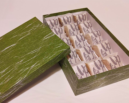 寒晒白玉粉の中に細かくした柚子の砂糖づけを入れて、入念に練り上げた日もちのするお菓子です。