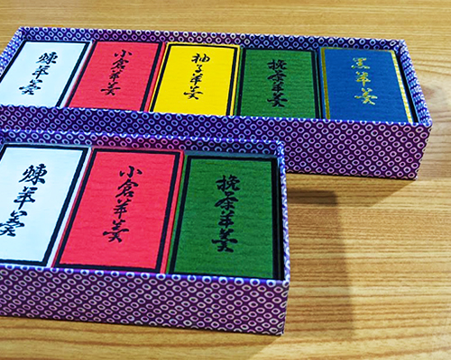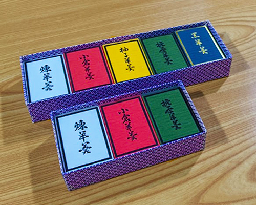 五色のかわいい羊羹です。練、小倉、柚子、抹茶、黒糖の五つのお味がございます。練は定番のこしあんの羊羹、小倉は小豆の感触が楽しめるつぶしの羊羹、柚子は柚子の砂糖づけを細かくして練り上げた羊羹、抹茶はお抹茶の粉末を混ぜて練り上げた羊羹、黒は黒糖を溶かして練り上げた羊羹です。